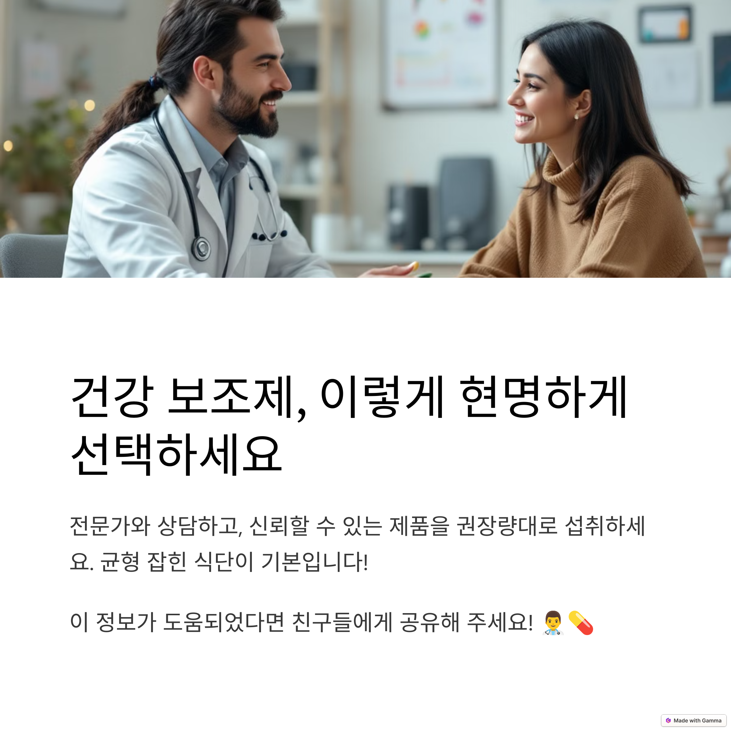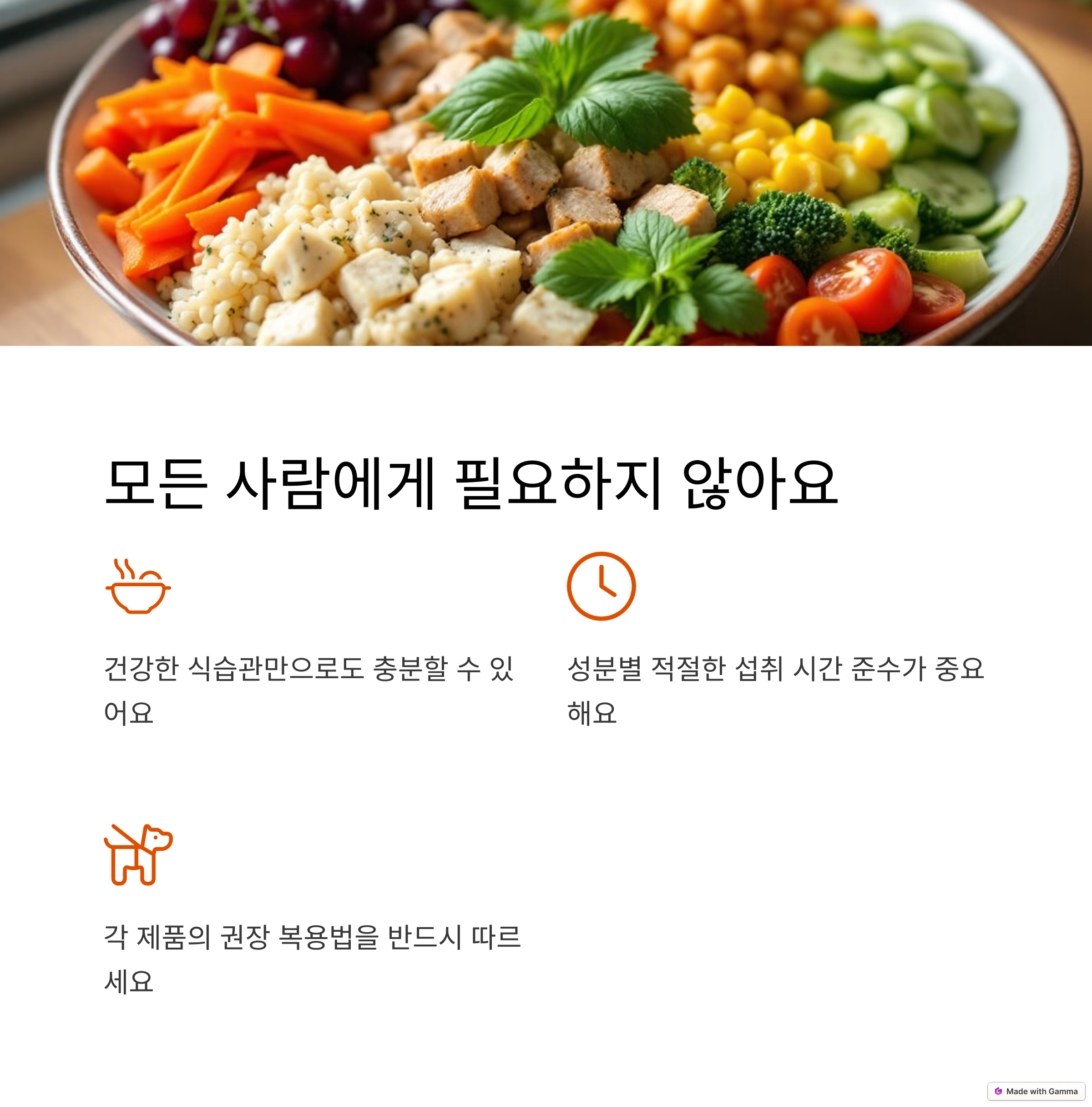 건강 보조제는 개인의 건강 상태와 필요에 따라 선택해야 합니다. 무조건 유행하는 제품을 따르기보다는, 자신에게 맞는 성분과 용량을 고려하는 것이 중요합니다.