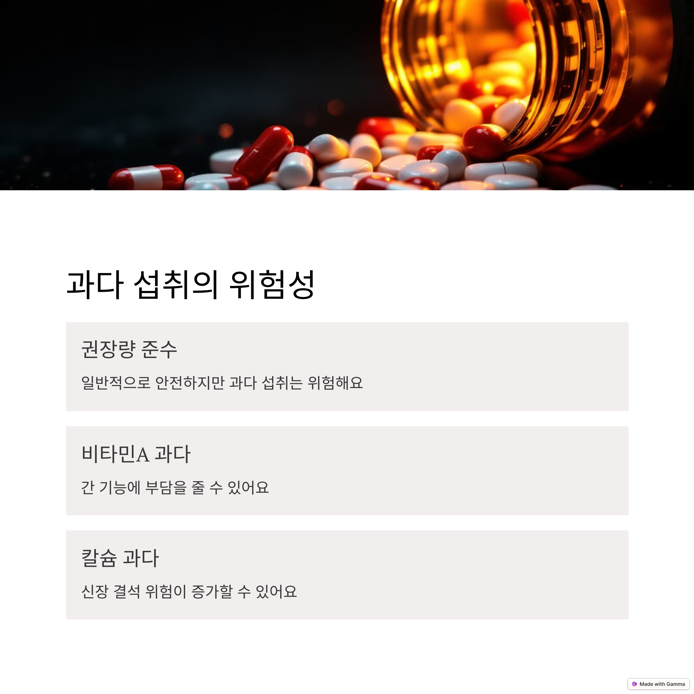 건강 보조제는 우리 몸의 부족한 영양소를 보완하는 좋은 방법이지만, 무조건 많이 먹는다고 해서 건강이 향상되는 것은 아닙니다. 올바른 제품을 선택하고 적정량을 섭취하는 것이 중요합니다. 또한 건강 보조제만으로 건강을 유지할 수 없다는 점을 기억해야 합니다. 균형 잡힌 식사와 꾸준한 운동을 병행하는 것이 건강을 유지하는 핵심입니다.