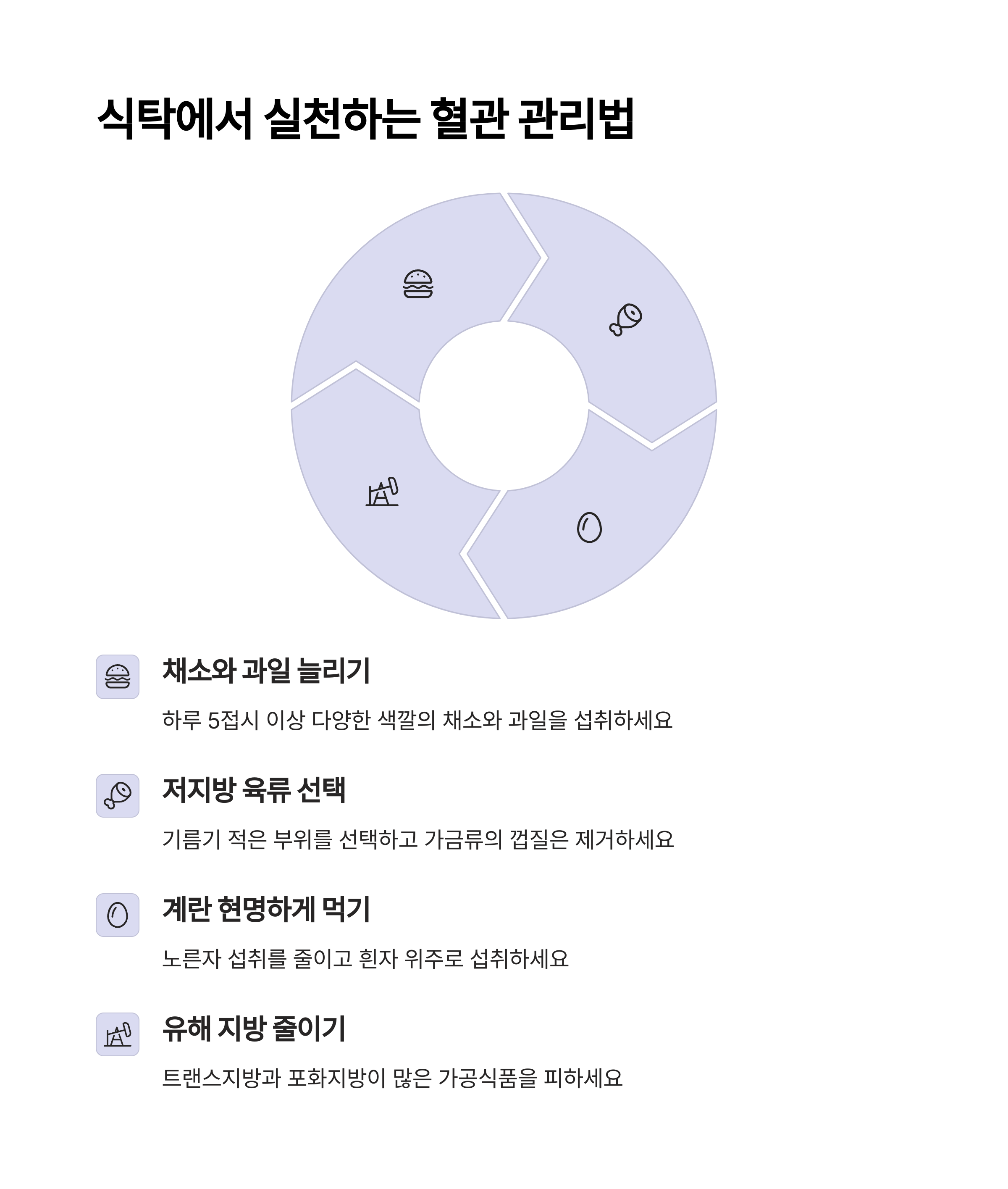 혈관 건강을 위해 중요한 것은 균형 잡힌 식습관입니다. 단일 식품만으로 콜레스테롤 수치를 낮추기는 어렵지만, 다양한 영양소를 포함한 식단을 구성하면 효과적으로 건강을 관리할 수 있습니다. 식단뿐만 아니라 적절한 운동과 건강한 생활 습관도 병행해야 합니다. 콜레스테롤 관리를 위한 올바른 식습관과 라이프스타일을 유지하는 것이 장기적인 건강을 위한 최선의 방법입니다.