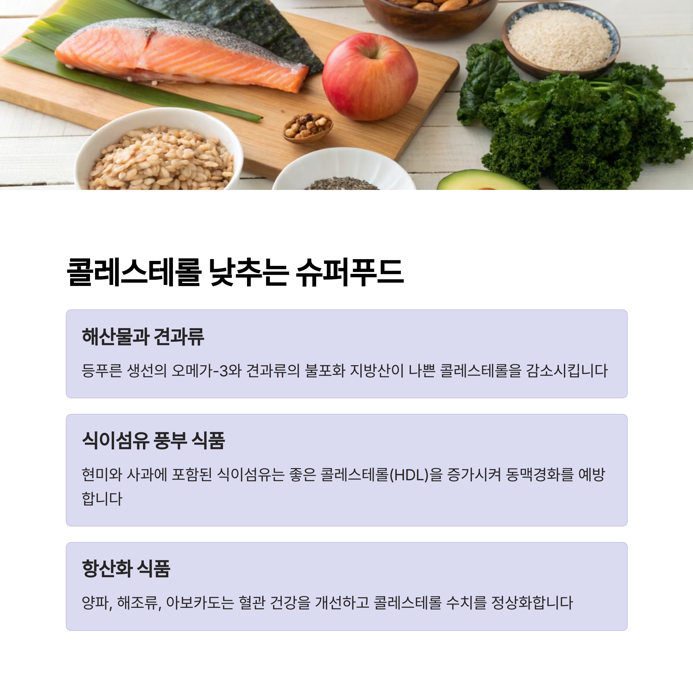 대표적인 음식으로는 등푸른 생선, 견과류, 현미, 양파, 사과, 해조류, 아보카도가 있습니다. 등푸른 생선은 오메가-3 지방산이 풍부하여 혈중 콜레스테롤과 혈압을 낮추고, 심혈관 질환 예방에 도움을 줍니다. 견과류는 불포화 지방산이 많아 나쁜 콜레스테롤(LDL)을 줄이고, 좋은 콜레스테롤(HDL)을 증가시켜 혈관 건강을 개선합니다. 또한, 현미는 피토스테롤과 비타민 E를 함유하고 있어 동맥경화 예방 효과가 뛰어납니다.