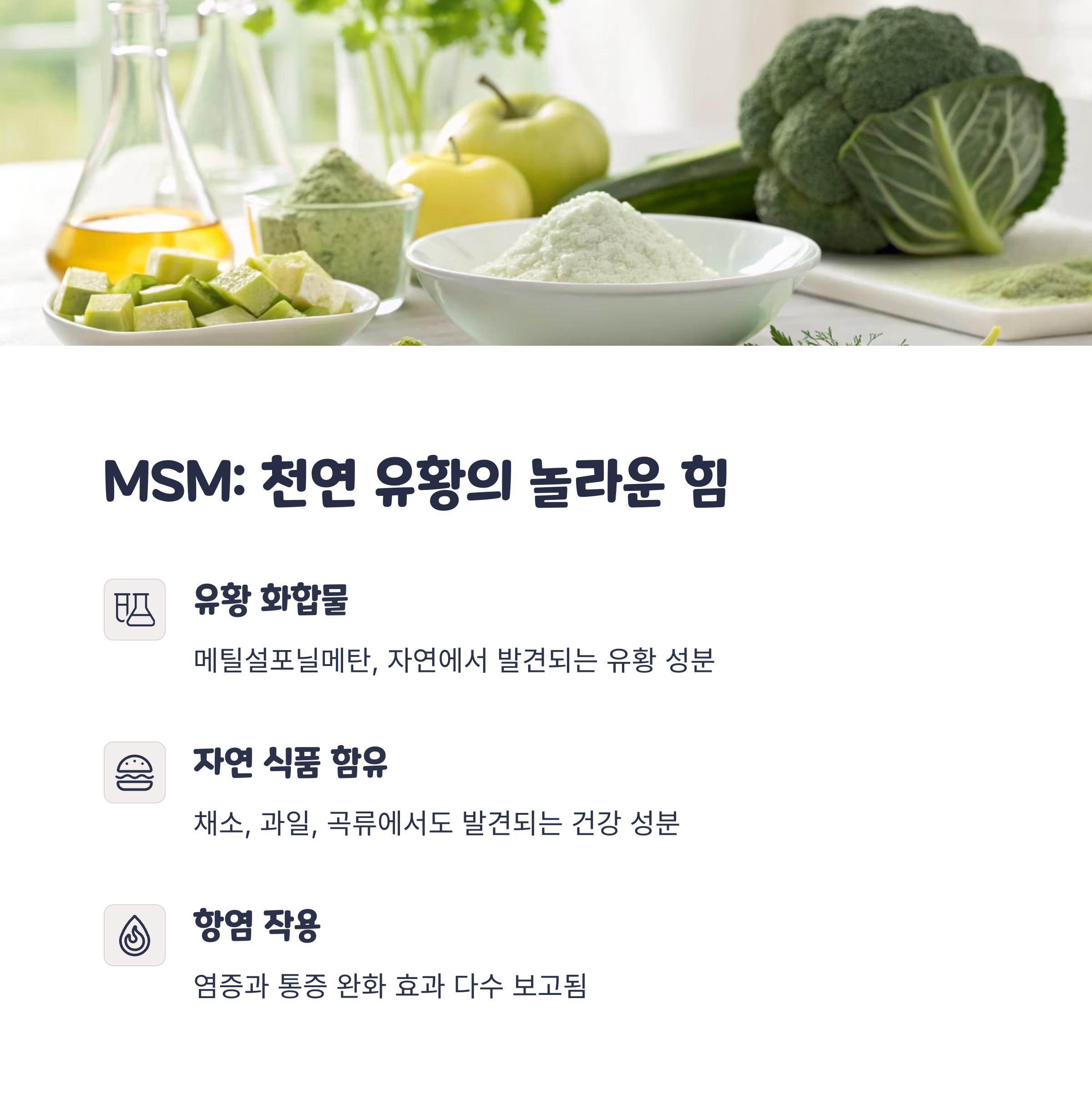 "MSM은 천연 유래 유황 화합물로, 항염증 작용과 통증 완화에 효과적인 성분입니다."