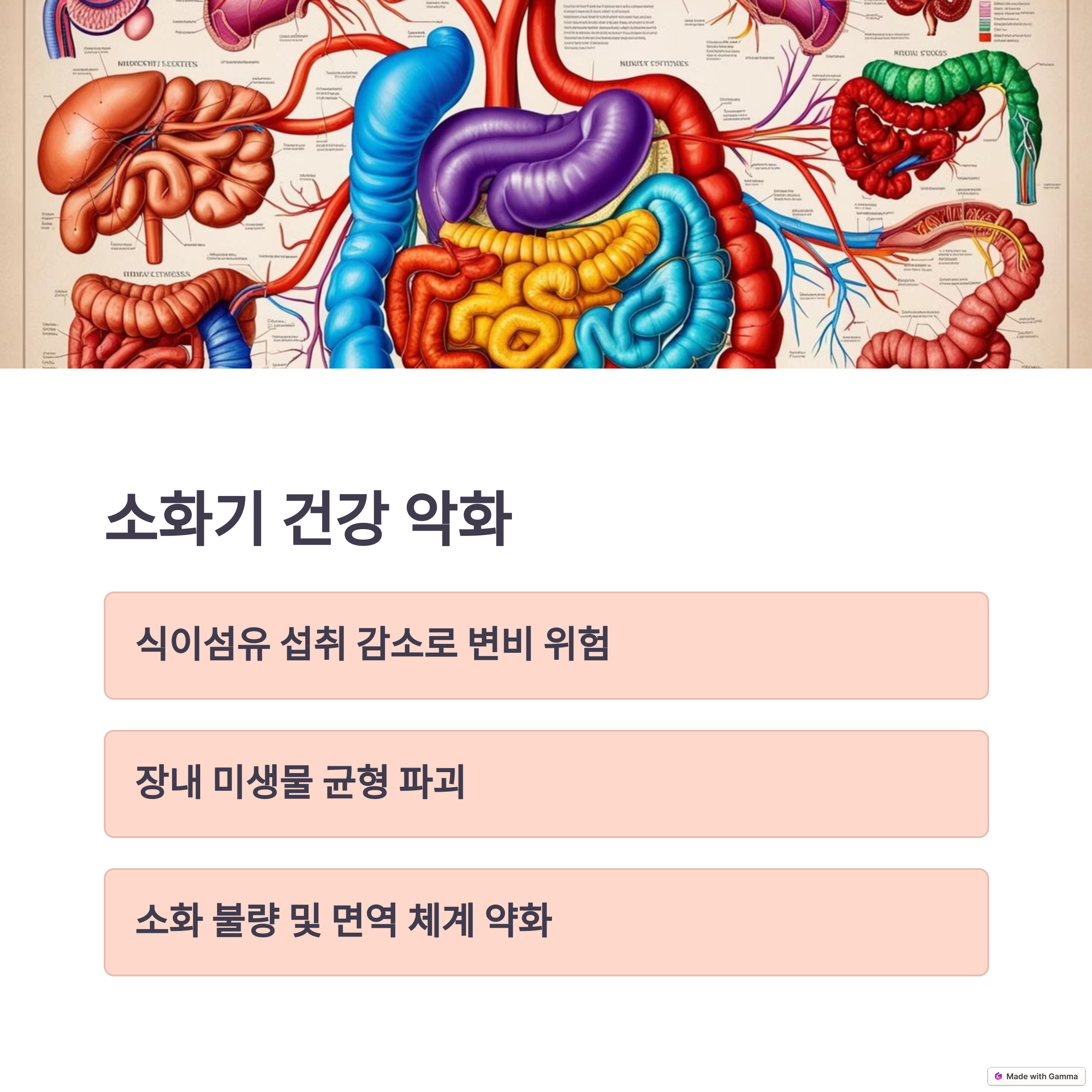 식이섬유가 풍부한 탄수화물 섭취 제한은 장내 미생물 불균형과 변비를 유발해요. 이는 면역력 저하와 전신 염증 증가로 이어질 수 있어요.