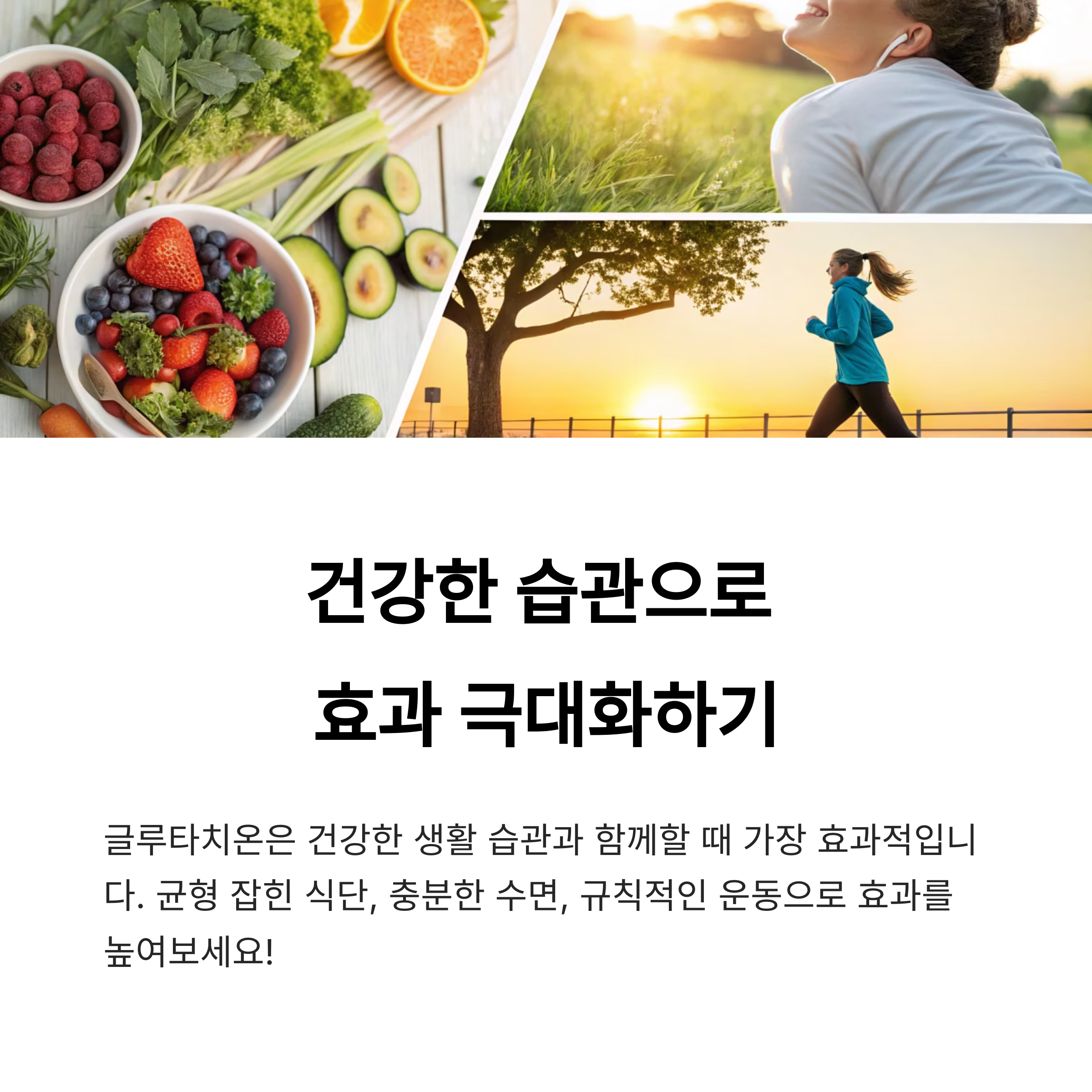 무엇보다 글루타치온 보충제는 건강한 생활 습관의 보조제라는 점을 기억하는 것이 좋습니다. 충분한 수면, 균형 잡힌 식단, 적절한 운동, 스트레스 관리가 함께 이루어질 때 글루타티온의 효과를 극대화할 수 있습니다.