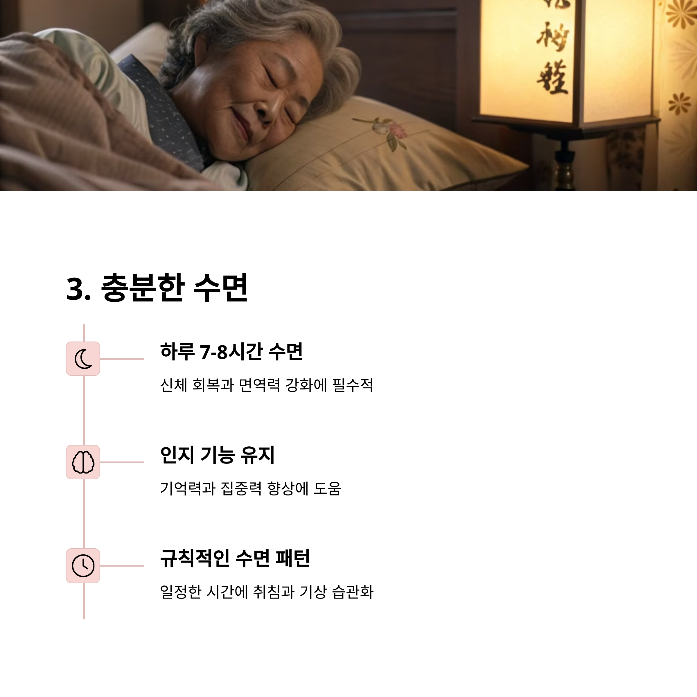 노년기 건강을 유지하려면 사회적 교류와 충분한 수면도 중요합니다. 가족 및 친구와의 관계를 유지하면 정신 건강에 도움이 되고, 우울증 예방에도 효과적입니다. 또한, 규칙적인 수면 패턴을 유지하면 면역력 증가 및 인지 기능 유지에 긍정적인 영향을 줍니다. 하루 7~9시간의 숙면을 취하는 것이 중요합니다.