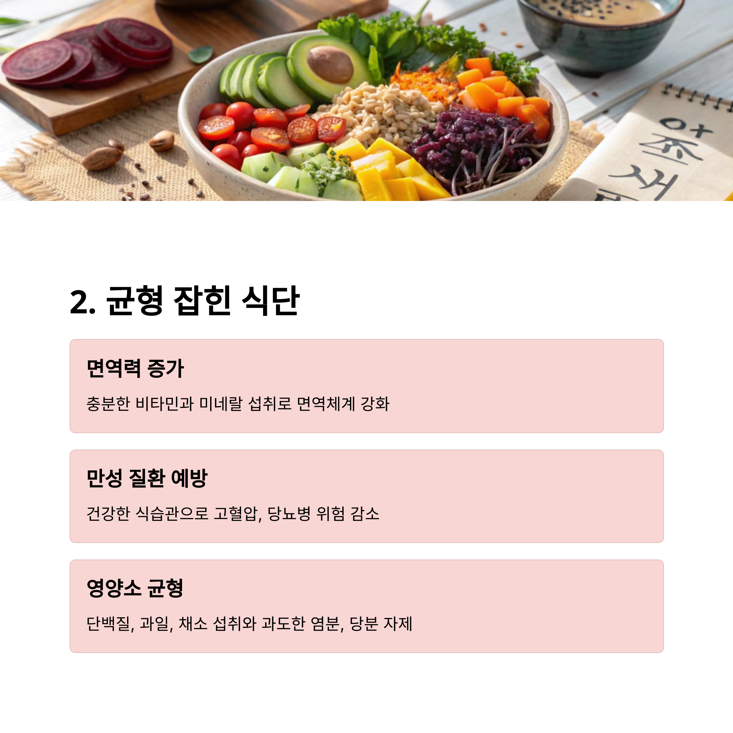 균형 잡힌 식단 | 면역력 강화, 만성 질환 예방 | 신선한 채소, 생선, 단백질 섭취 |