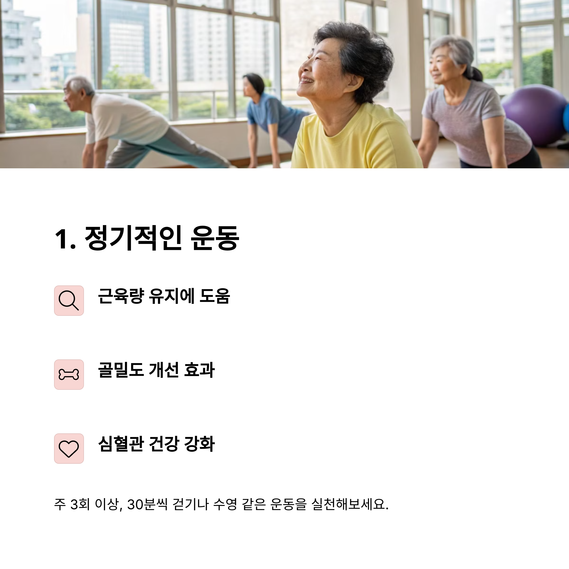 규칙적인 운동 근육량 유지 및 심혈관 건강 개선에 도움을 줍니다.