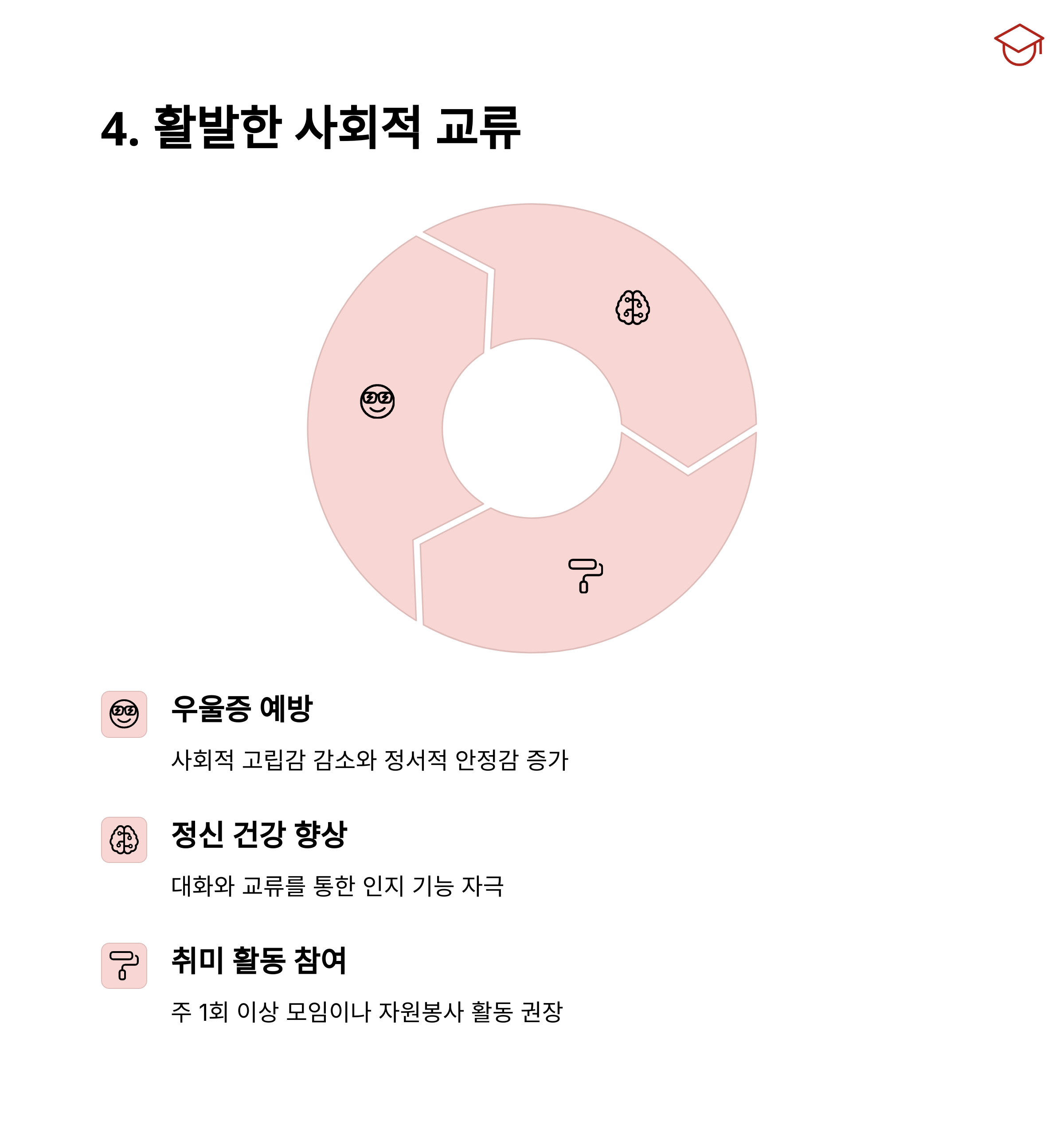 사회적 교류 | 정신 건강 개선, 인지 기능 유지 | 가족 모임, 친구와의 소통 유지 |