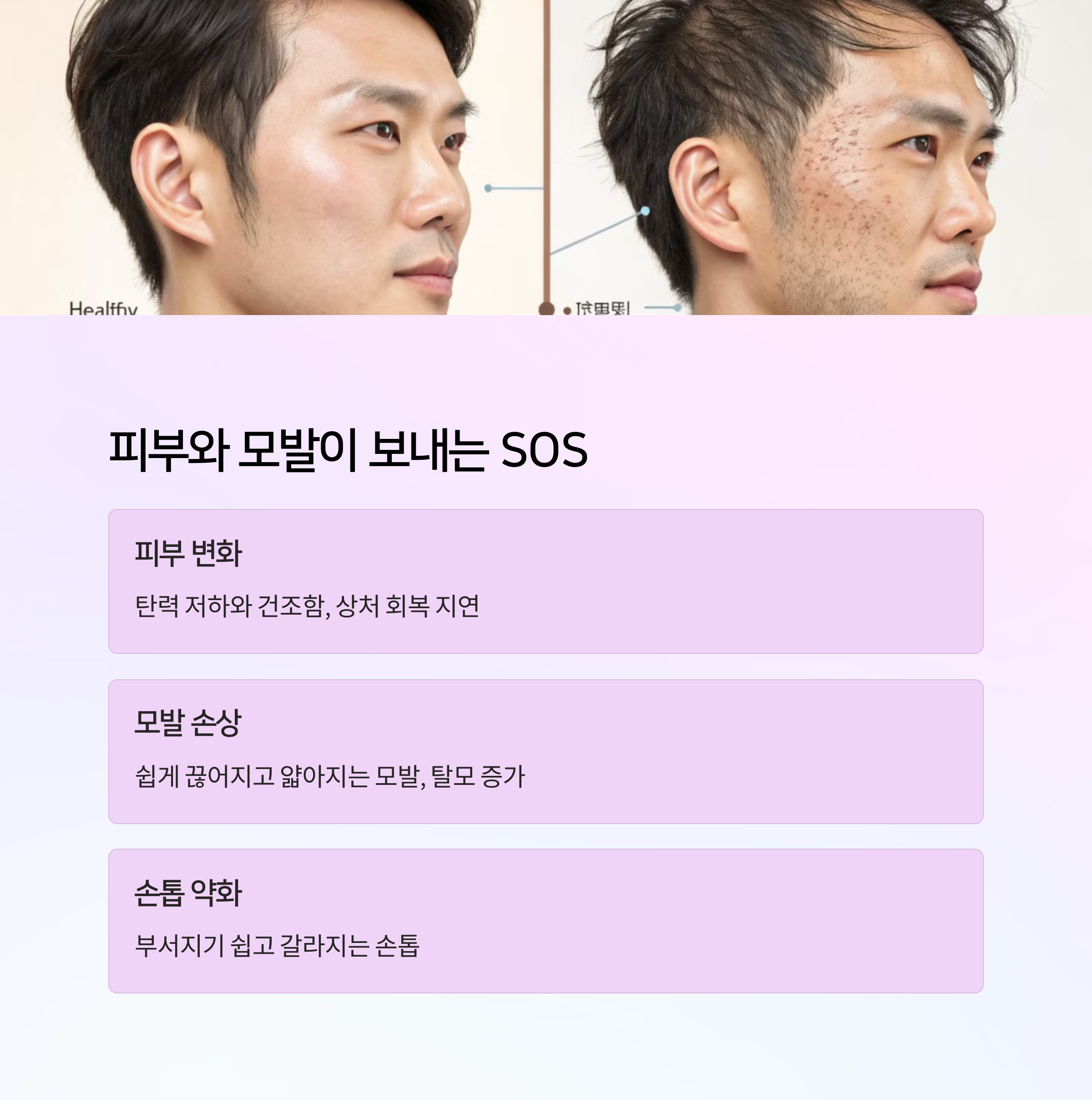 단백질이 부족하면 혈중 알부민 수치가 감소하여 체액이 조직에 축적되면서 부종이 발생할 수 있습니다. 또한, 단백질은 피부·모발·손톱의 주요 구성 요소이므로, 부족할 경우 피부 탄력 저하, 모발 손상, 손톱 갈라짐이 나타날 수 있습니다. 면역력을 유지하는 데도 단백질이 중요한 역할을 하므로, 부족하면 감기나 질병에 쉽게 걸릴 위험이 커집니다.