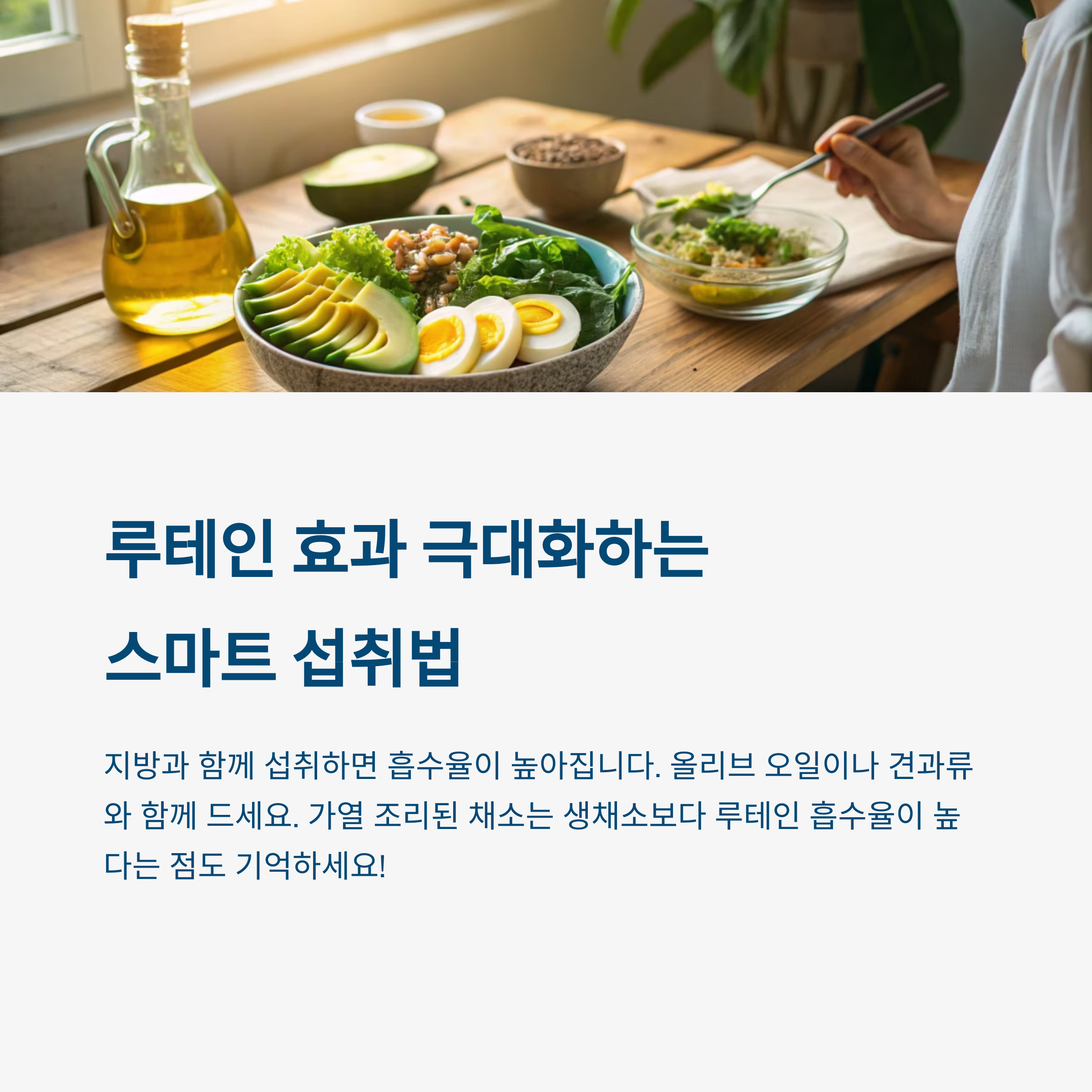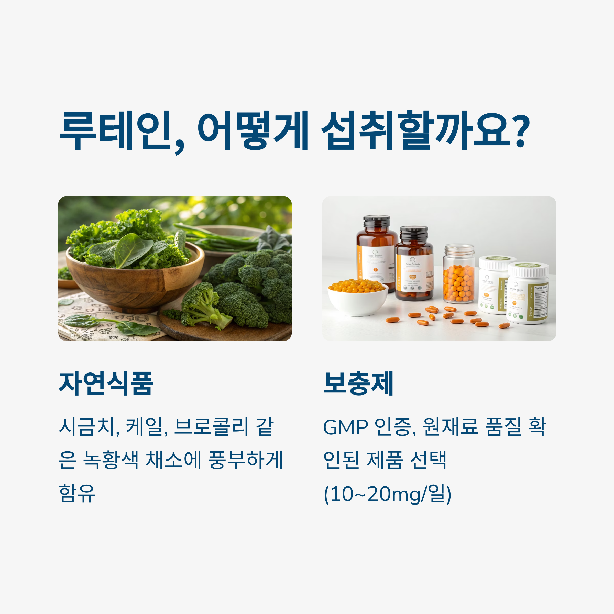 - 보충제: 필요 시 루테인 보충제를 통해 꾸준히 섭취할 수 있습니다.