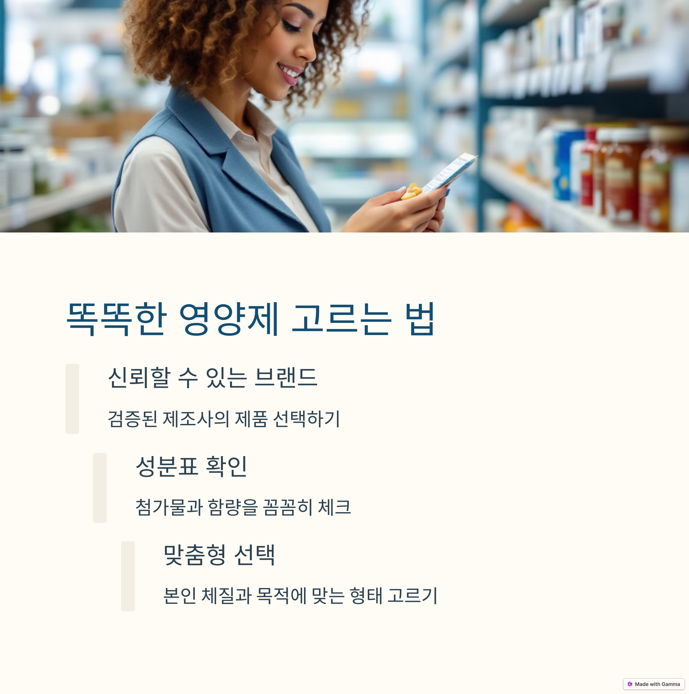 너무 비싼 제품이 항상 좋은 것은 아니니, 성분과 함량을 꼼꼼히 확인하세요. 그리고 영양제는 어디까지나 보조제일 뿐, 과일과 채소를 통한 자연 섭취가 가장 좋다는 것도 기억하세요.