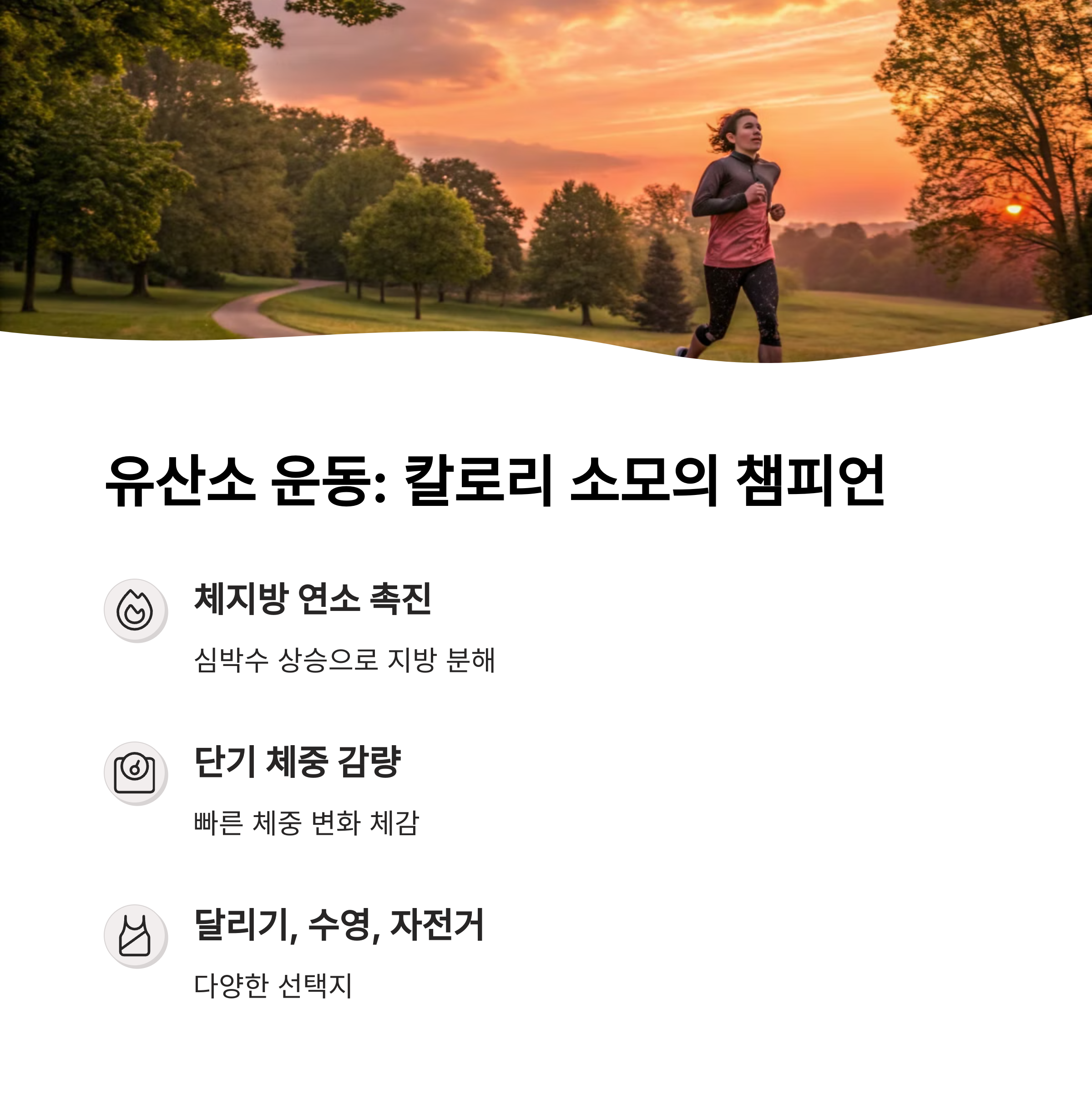| 유산소 운동 | 지방 연소에 효과적, 심폐 기능 향상 |