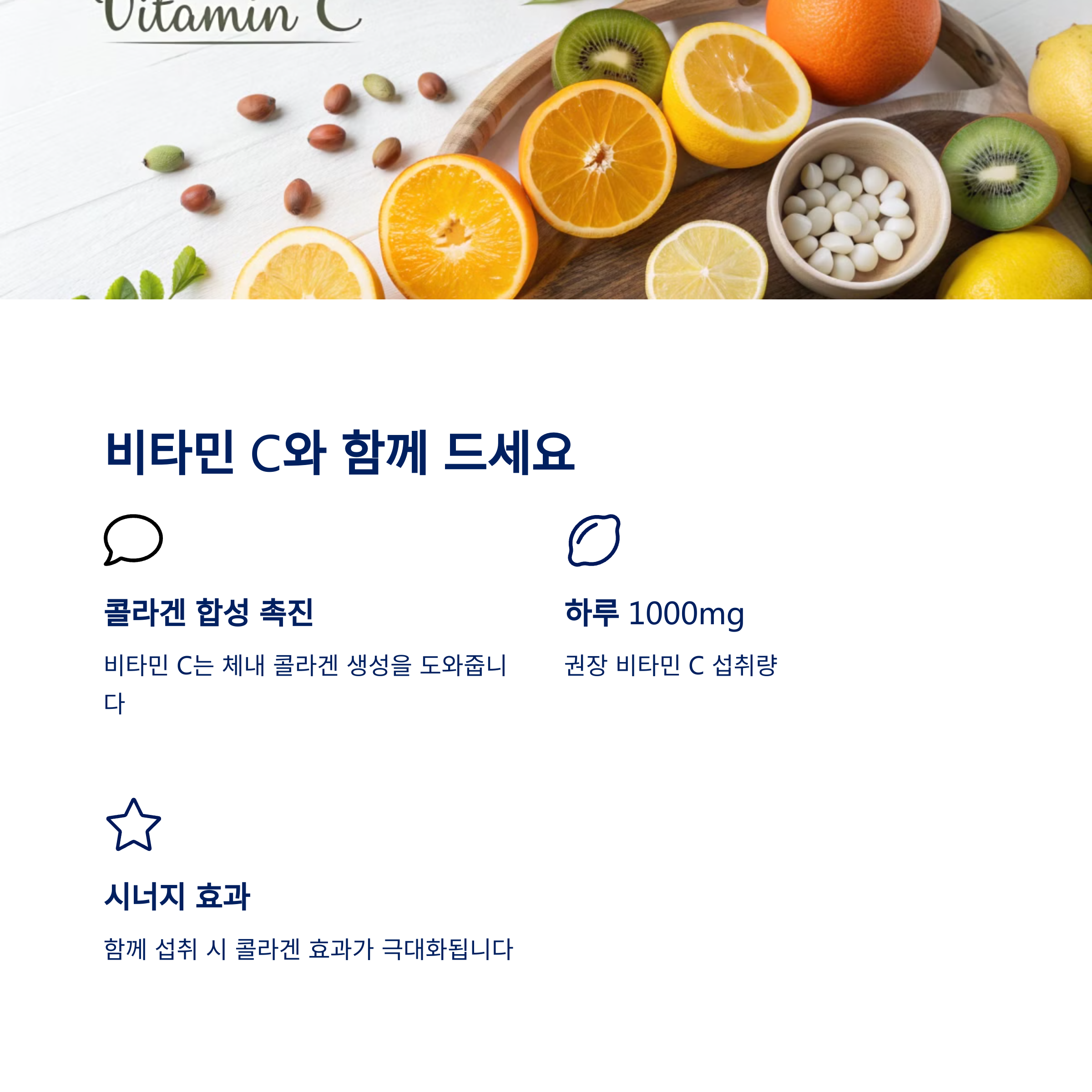 | 2.5~15g의 콜라겐 | 공복 섭취 권장 | 비타민 C 1000mg |