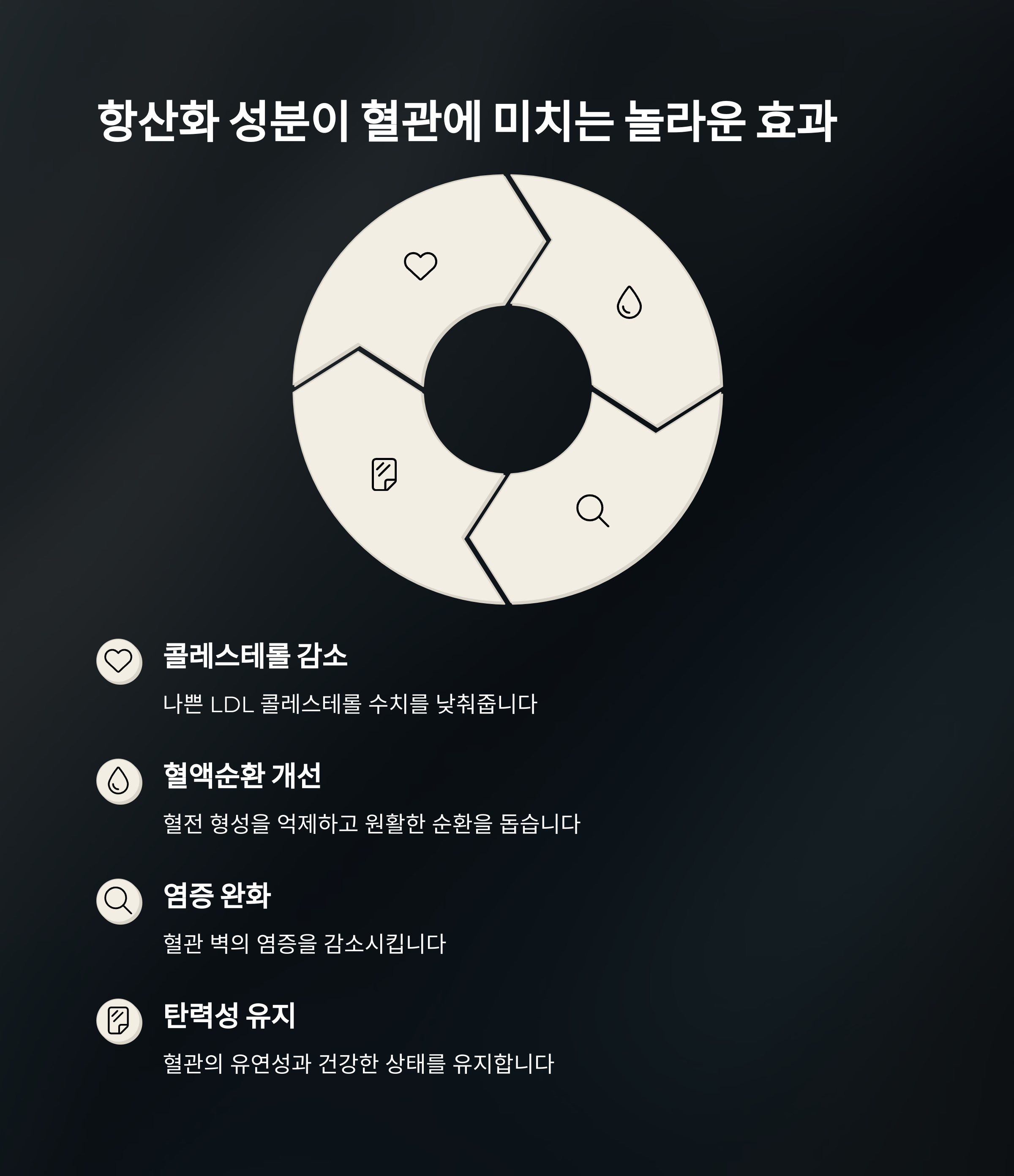 항산화 식품은 혈관 건강 유지에 중요한 역할을 합니다. 연구 결과에 따르면, 항산화 식품을 많이 섭취하는 사람들은 심혈관 질환의 위험이 현저히 낮아진다고 합니다. 퀘르세틴, 레스베라트롤, 안토시아닌 등의 항산화 성분은 내피 기능 개선, 혈압 조절, LDL 콜레스테롤 산화 억제 등 다양한 방식으로 혈관 건강을 개선합니다.