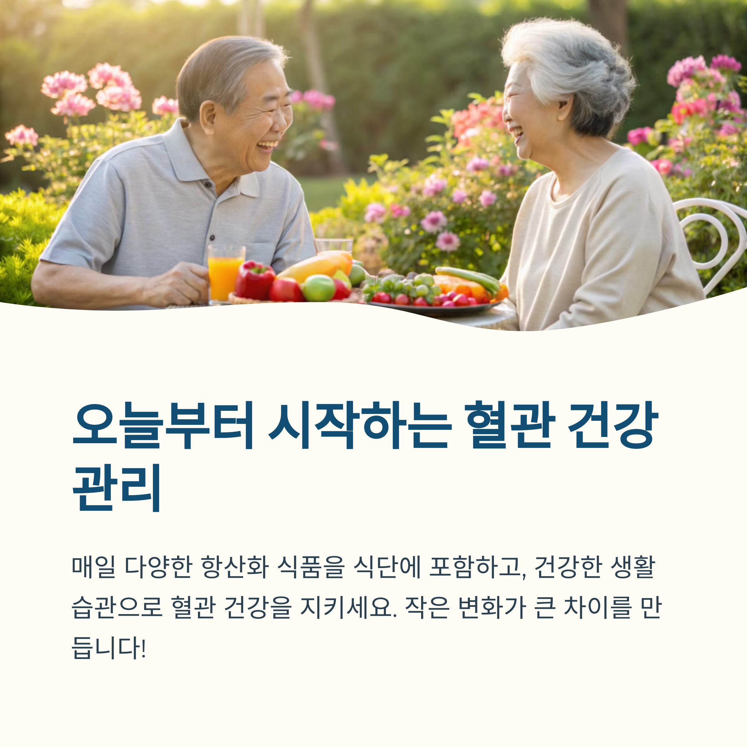 우리의 혈관 건강은 하루아침에 만들어지는 것이 아닙니다. 매일의 작은 식습관 변화가 모여 건강한 혈관을 만들어갑니다. 오늘부터 이러한 항산화 식품들을 조금씩 식단에 도입하여 건강한 혈관, 건강한 삶을 유지해 보시기 바랍니다.