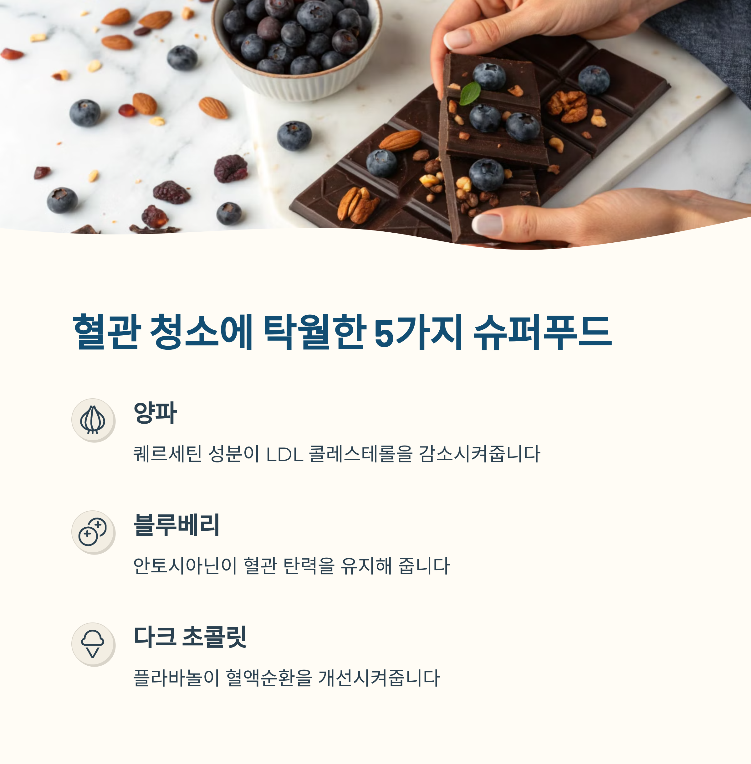 현대인의 식습관과 생활 방식은 혈관 건강에 많은 위협이 되고 있습니다. 불규칙한 식사, 가공식품 섭취 증가, 운동 부족 등으로 인해 혈관에 노폐물이 쌓이고 혈관 건강이 악화되는 사례가 늘고 있습니다. 이러한 상황에서 항산화 식품은 우리 혈관을 청소하고 건강을 유지하는 데 중요한 역할을 합니다. 항산화 성분은 체내 산화 스트레스를 줄이고 혈관 벽을 보호하며 콜레스테롤 수치를 개선함으로써 심혈관 질환의 위험을 낮추는 데 도움을 줍니다. 이 글에서는 혈관 청소에 효과적인 항산화 식품들과 그 효능, 그리고 일상생활에서 쉽게 활용할 수 있는 섭취 방법에 대해 알아보겠습니다.