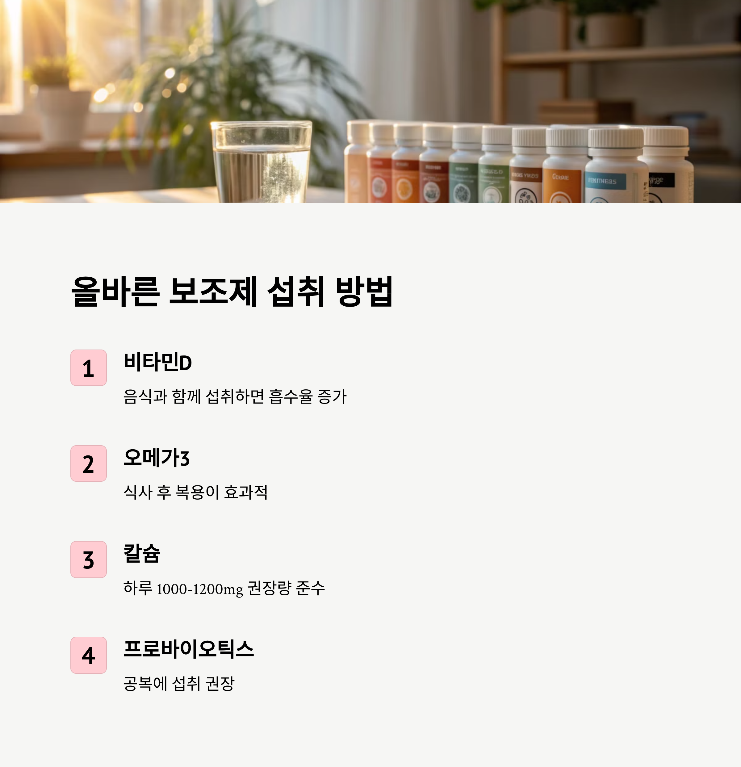 건강 보조제의 효과를 높이려면 섭취 시간과 방식이 중요합니다. 예를 들어, 비타민D는 음식과 함께 섭취하면 흡수율이 높아지고, 오메가3는 식사 후에 복용하는 것이 좋습니다. 또한 꾸준히 섭취하는 것이 효과를 높이는 중요한 방법입니다.